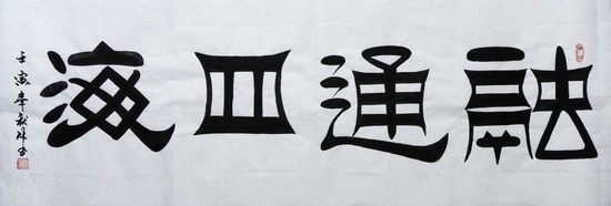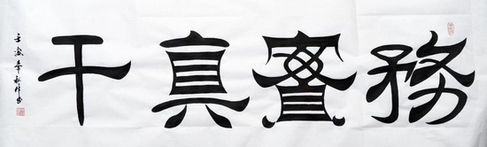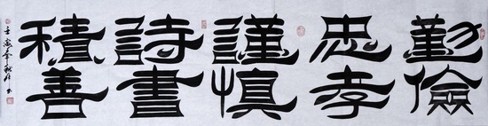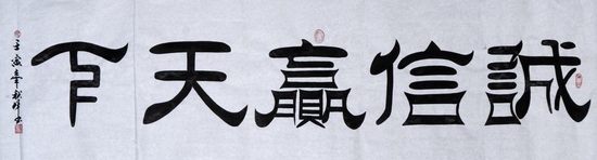 陈绪夏的篆、隶、楷、行、草为基础成体,且融会贯通,尤善行书、正楷。作品风骨奇伟,气息融通,蕴藉内敛,既古韵典雅,又翰逸神飞。纯正且飘逸,虬劲中透着婉约,精淳中裹着坦荡。(王华)